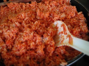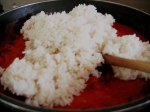 | Carefully mix in the cooked rice to the tomato mixture. |