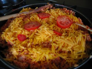 In large skillet, fry the onion in 2 tablespoons oil or butter until golden brown. Add peeled and diced tomatoes (if using fresh) or 1 small can tomato paste and 1 small can water. Simmer until soft if using fresh, or simmer 5 minutes if using canned. Add grated cheddar and rice. Mix well. Season with freshly ground pepper. If you wish to add more protein – serve with hard boiled eggs or devilled eggs. Other extras could be corn on the cob, or sliced cucumber and carrots from your garden. This recipe serves 4 in our home. I usually double it for 8.