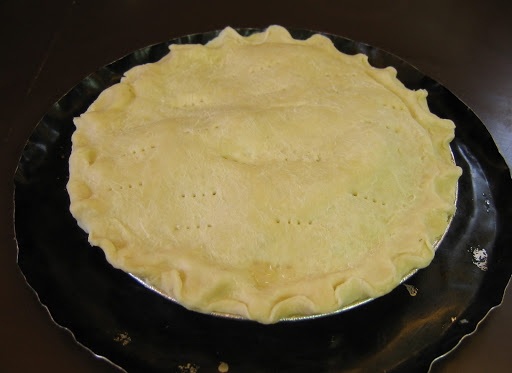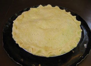 To make the crust place flour, sugar and salt into a large bowl. Mix together with a spoon until combined. Add butter pieces to the dry ingredients mixture. With fingers, start rubbing together the butter and the dry ingredients. This will take some time. Do this until the resulting mixture looks like wet sand mixed with pebbles. You may also use a food processor to do this. Add the vinegar and rub into the mixture. Add water one tablespoon at a time, rubbing into the mixture. You want to add enough to create a dough that holds together well but is not wet. Divide into two fairly equal pieces a slightly smaller one for the top crust. Chill for 20-30 minutes if rolling by hand. Roll between plastic wrap or dry waxed sheets. If you need to dust with flour use tapioca or the sweet rice flour.