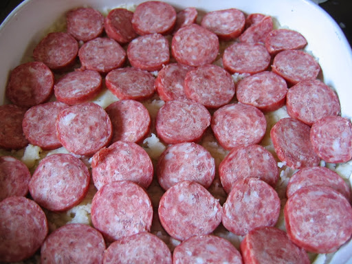 Slice farmers sausage into thin circles. Layer over potatoes.