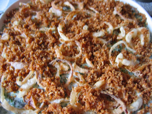 When ready to bake: sprinkle french fried onion rings over casserole (see recipe below). Combine bread crumbs and melted butter. Sprinkle over casserole. Bake uncovered at 350 for 40 minutes until filling is bubbly. Remove from oven and let sit for 5 to 10 minutes before serving. Top layer will be saucy. Serves 5-6 .