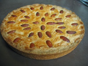 Cream butter, sugar and almond extract together. With a spoon or hands (not a mixer as it changes the character of the finished product) stir in the rice flour and egg. Mix well with hands or spoon.. Lightly grease a 9″ round baking pan (traditionally it is round -you may use a square pan). Pat the cake dough into the pan. Brush the top of the cake with milk or a glaze made with 1 egg white mixed with 1 tablespoon water. Lightly press the almonds onto the top of the cake. Bake at 350 degrees for 30 minutes. Store in plastic container in fridge. This cake will stay good for at least a week or more in the fridge. This cake tastes better and slices better after being in the fridge for at least 4 hours.