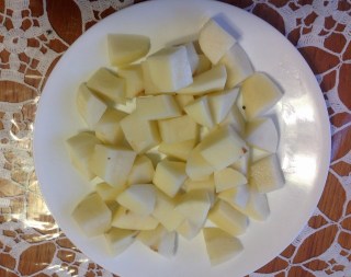 | peeled and chopped potatoes ready to be microwaved for a bit to “blanche” – this will prevent discoloring. |
