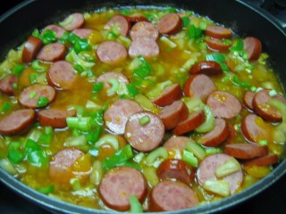 The recipe shown in the picture was done as a “dump” recipe right into the skillet and was ready in no time. The nice thing with this method is that the vegetables and fruit do not get overcooked. The Kielbasa I purchased from the supermarket was gluten free. We find the sausage tastes like a smokey. You could substitute with baked or canned ham or with cooked chicken pieces. Our four teenagers loved it!