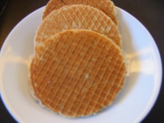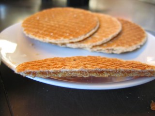 Heat your stroopwafel iron setting the dial to #3.  Once hot place a 1″ ball of dough on iron.  Close iron and let cook until the steam stops and the wafer is golden brown.  Quickly slice in half (try not to burn your fingers!) with a sharp thin bladed knife – I use a filleting knife.  Spread about 1 tablespoon syrup on wafer and cover with other half of wafer.  Place on baking sheet.  Freeze on baking sheet and then stack 6 to a pile and wrap tightly in plastic wrap – this prevents them from separating while in the freezer.