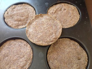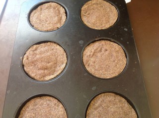 Mix the above altogether. Let sit for 15 minutes. Lightly grease a 6 “cup” muffin top pan and divide mixture into 10 portions. Put 6 portions into greased pan and wet fingers or spoon to spread out. Bake at 425 for 10 minutes. Cool and remove and then do the other 4. I freeze these and toast when needed. About 122 calories per bun.