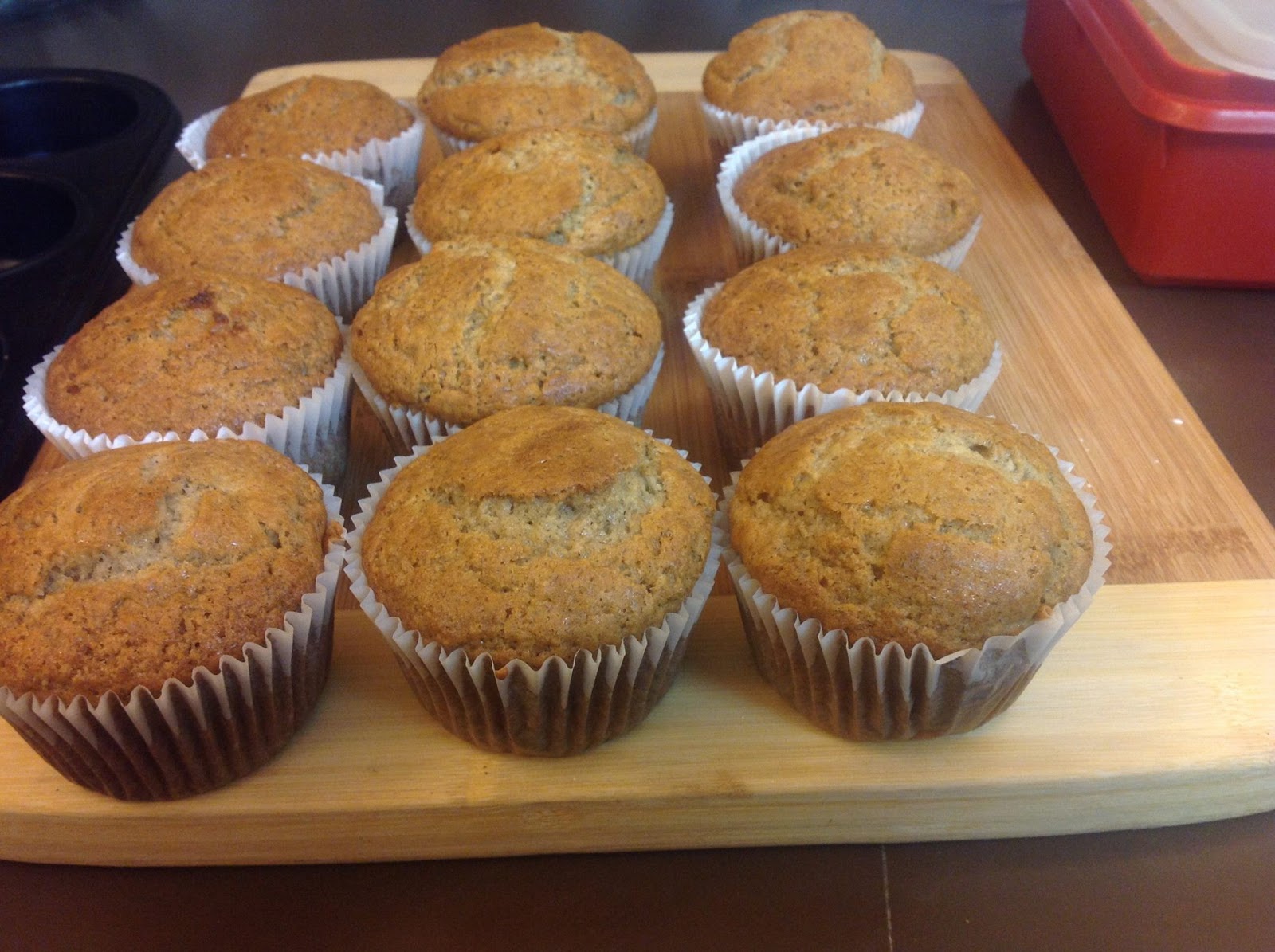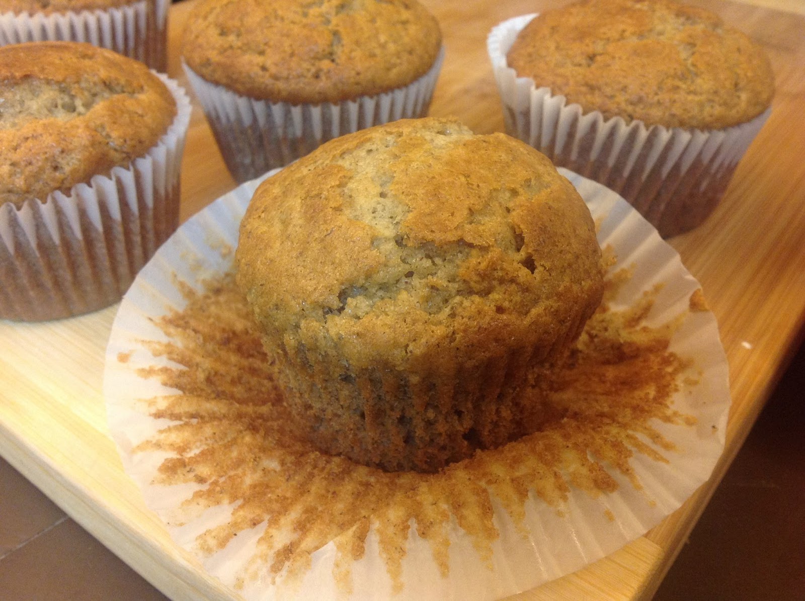 Place dry ingredients in mixing bowl. Wisk together with fork or wisk. In 2 cup measurer place the pureed banana, oil and egg. Mix together with fork until blended well. Make well in center of dry mixture. Pour in the wet mixture and the water (or sour milk) – mixing lightly with fork until blended. Divide into 12 paper lined muffin cups.