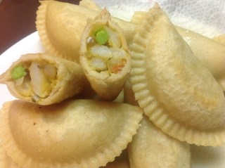 Notes: I tripled the filling recipe however used 8 cups potatoes rather than 6 cups. We used 2kg (4.4lbs)’of Masa flour. Total made was 164 4″ samosas.
