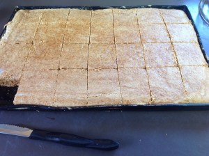 Bake at 375 for 20 minutes until golden brown. Let cool. Slice in squares. Store in sealed plastic containers in fridge for 3 days or longer. The texture is a bit “gummy” when fresh and improves a lot upon storage.