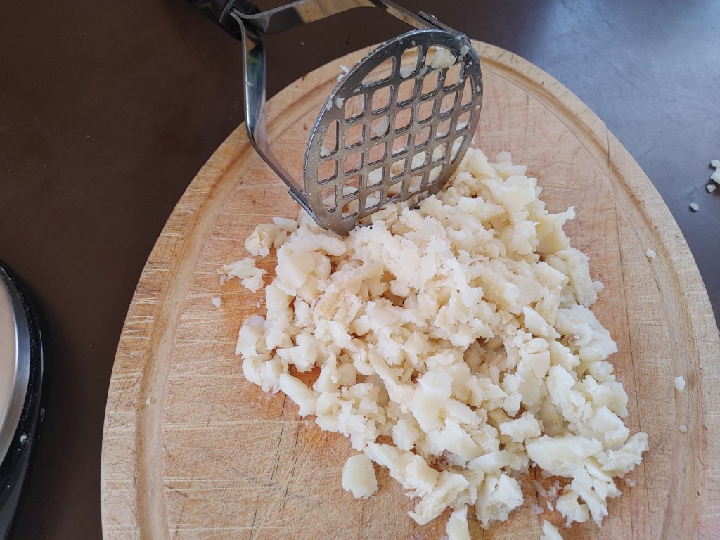 Notes: Cook 1 large potato in water until done. Drain water – you may use for the recipe for the water or even to replace the milk. Mash the drained potato with a fork or potato masher into small chunks the size of peas. Do not puree or whip with beaters as you want the little pieces. Let cool .