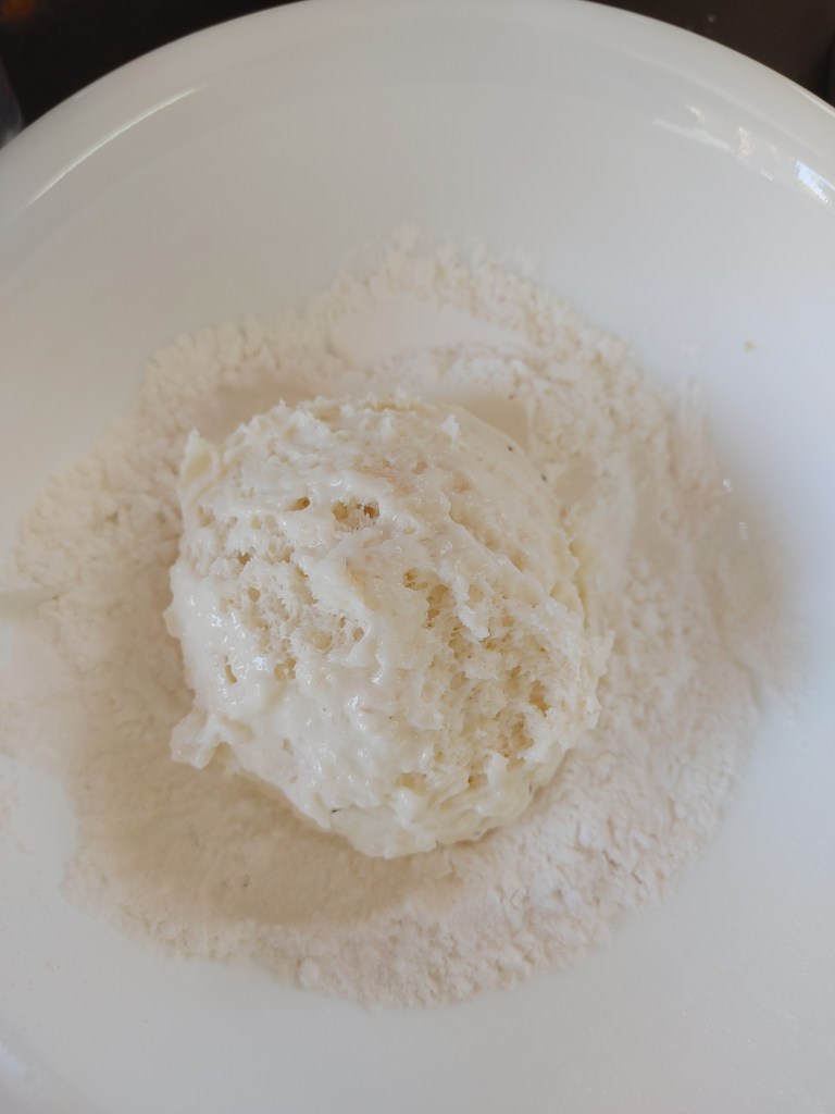 Scoop a generous 1/2 cup of the dough/batter into the rice flour and using a spoon lightly coat with flour. Using your hands gently roll it into a nice ball and place on greased baking pan. Make 8- 10.